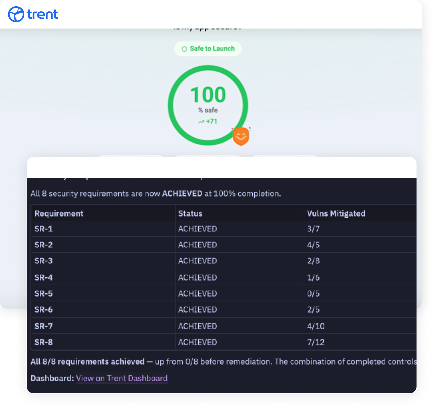 As your application changes, re-run assessments to track whether your security is improving or degrading. Trent continuously re-assesses, so your project stays secure no matter how fast you move.