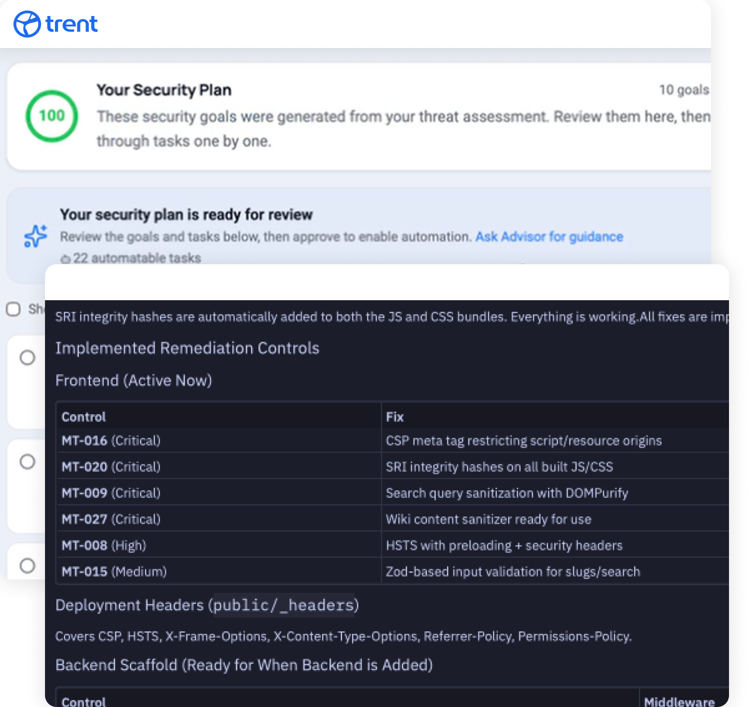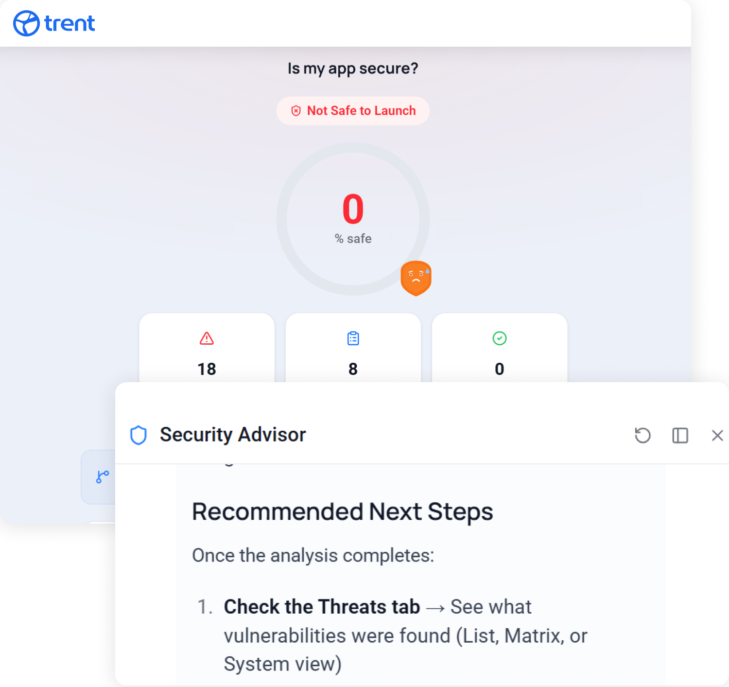 For teams that want more, connecting your source code repository unlocks Trent’s full Scan, Judge, Mitigate, Evaluate cycle with automated fixes. The URL-based assessment is the fastest way to understand where you stand. From there, you decide how far to go.